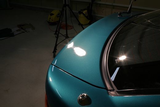 このクルマのように劣化が進行している場合、研磨調整後は無機のガラスコーティングよりも塗装と同じ有機系のポリマーコートまたはWAXを塗り込み、塗装分子に潤いを与えて塗装そのものを再強化し、時々WAXやポリマーでメンテした方が良いでしょう。